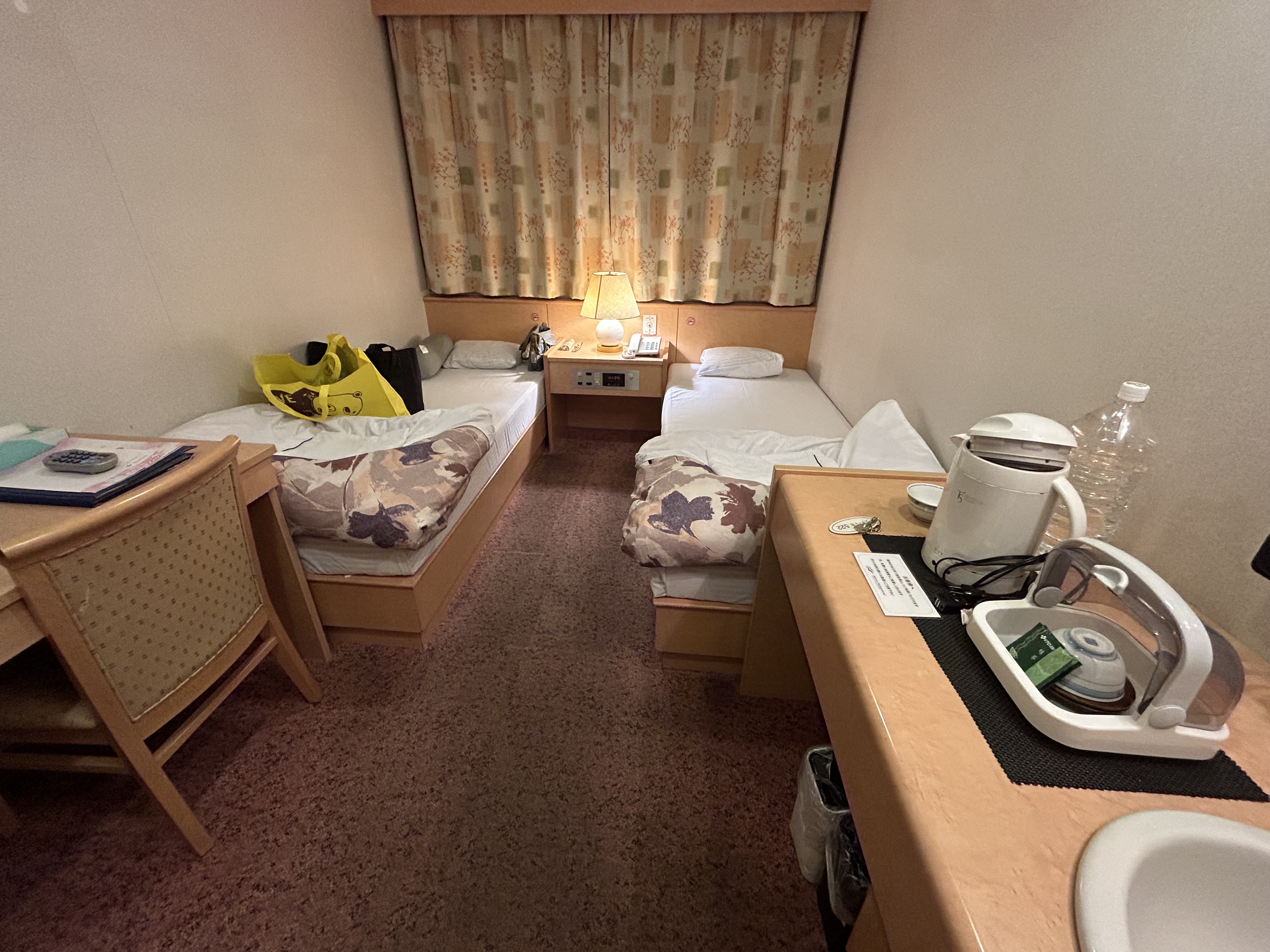 客室は快適そうなツイン。備え付けのパジャマに着替えてお疲れさんBeerはサッポロクラシック。ふ〜。