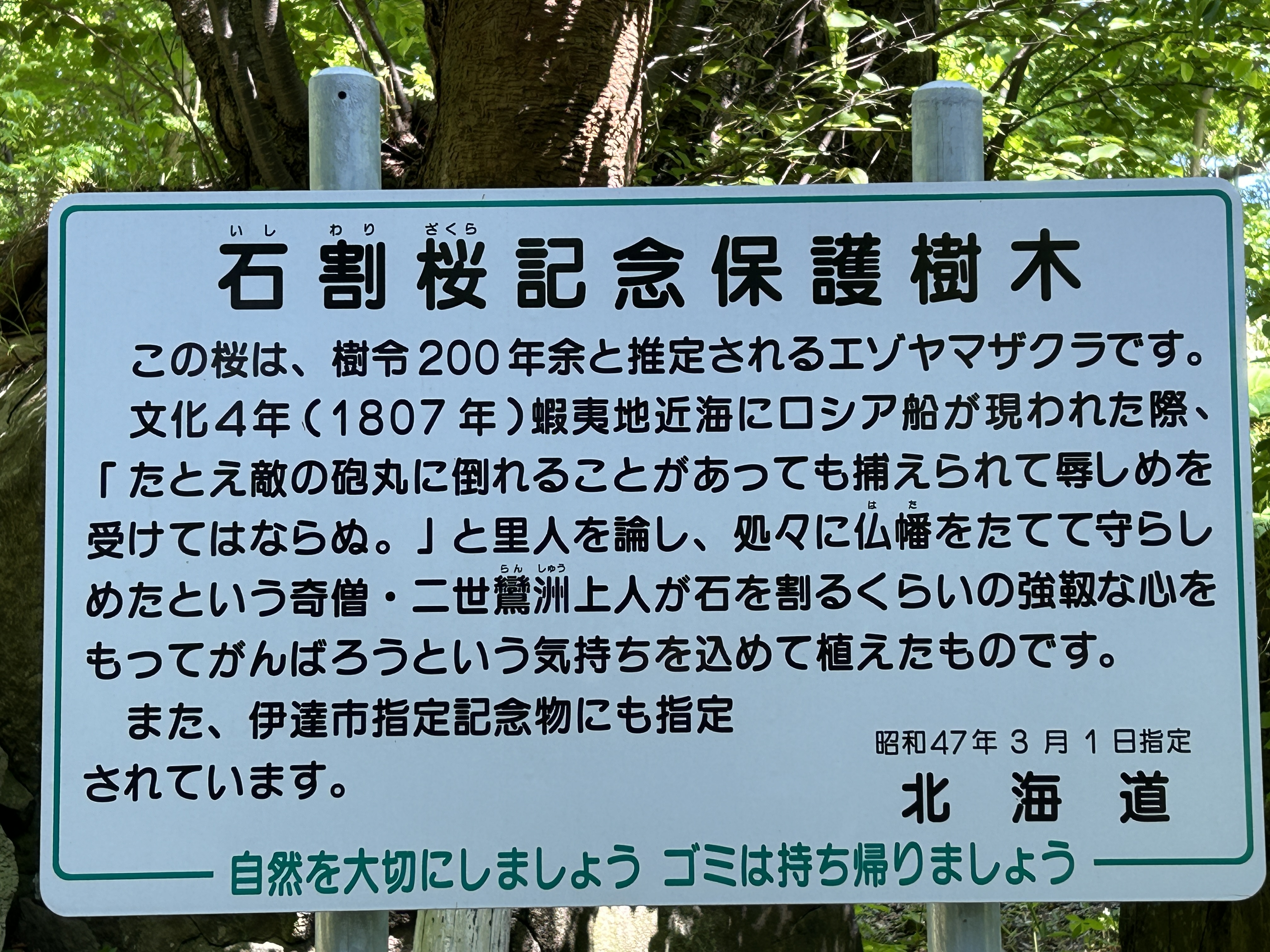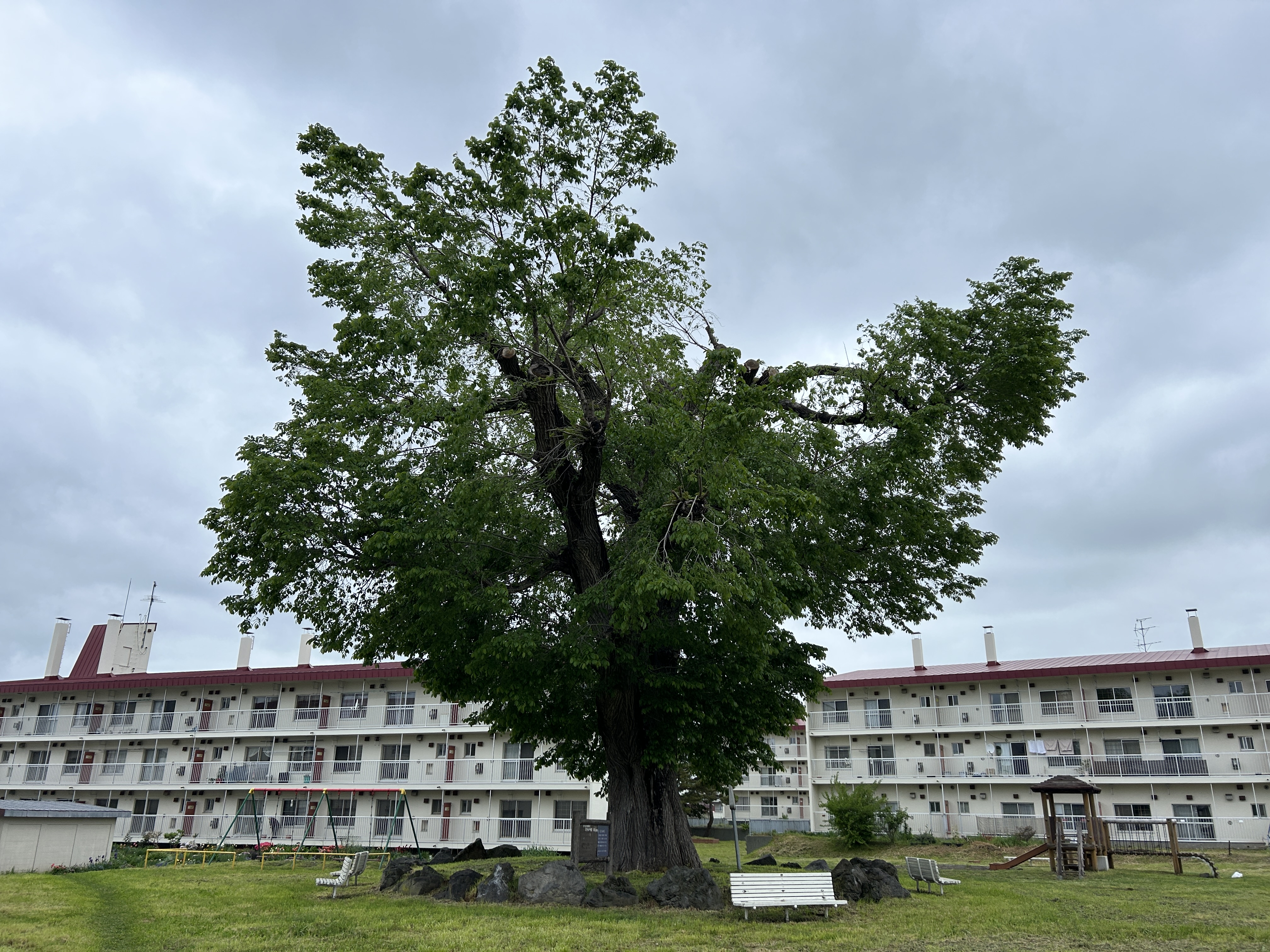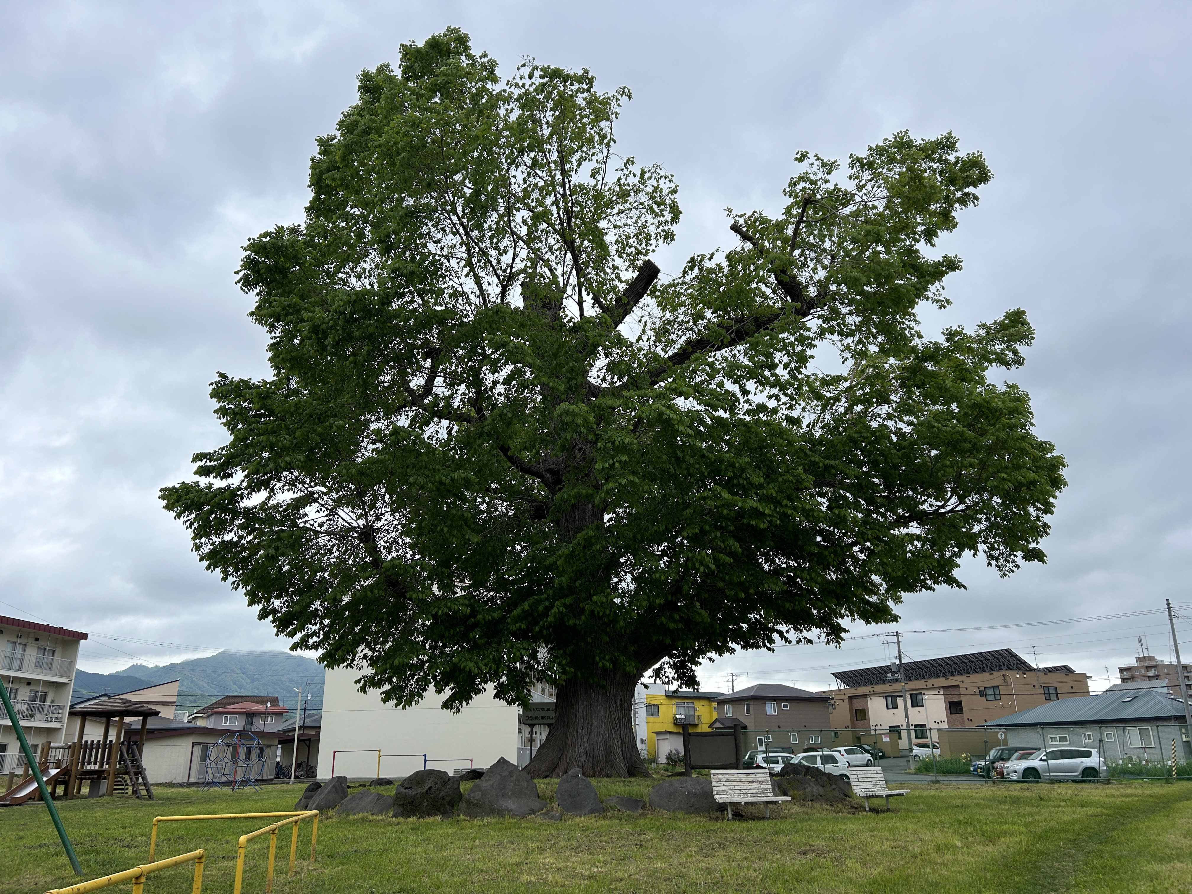 明治初期、伊達邦成の統治時代に“百叩きの樹”と呼ばれていたそう。ちょっと悲しい歴史なれど今は公園の真ん中でどん!としている。