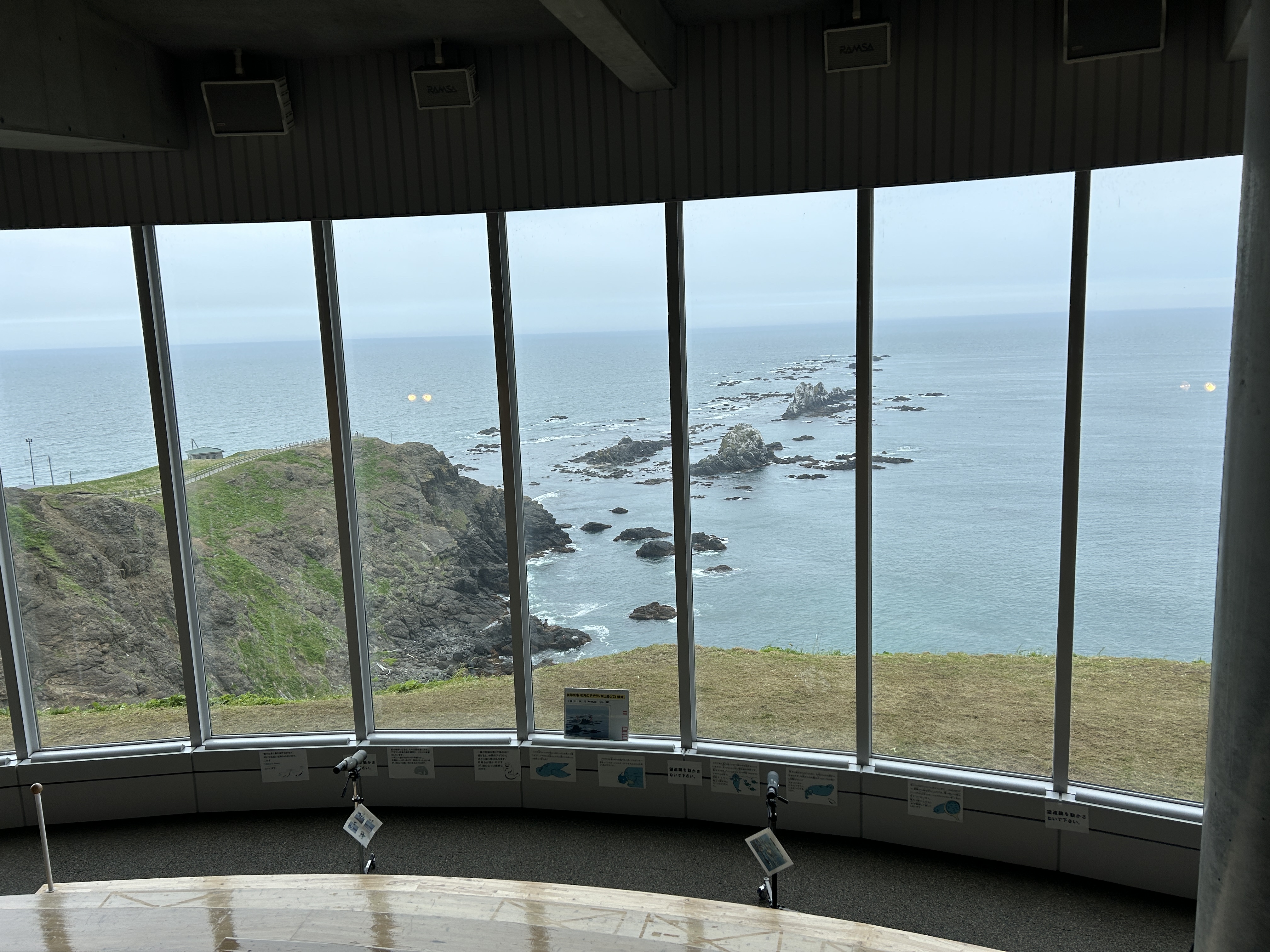 あまりの寒さに“風の館”に逃げ込む(@300)。寒さしのぎに入ったつもりでしたが、ガラス張りの展望ゾーンに行ってみると望遠鏡がいくつも置いてあり、望遠鏡を覗いてみると遠くにいるゼニガタアザラシが海上岩場でゴロンゴロンする姿を観察することが出来ます。