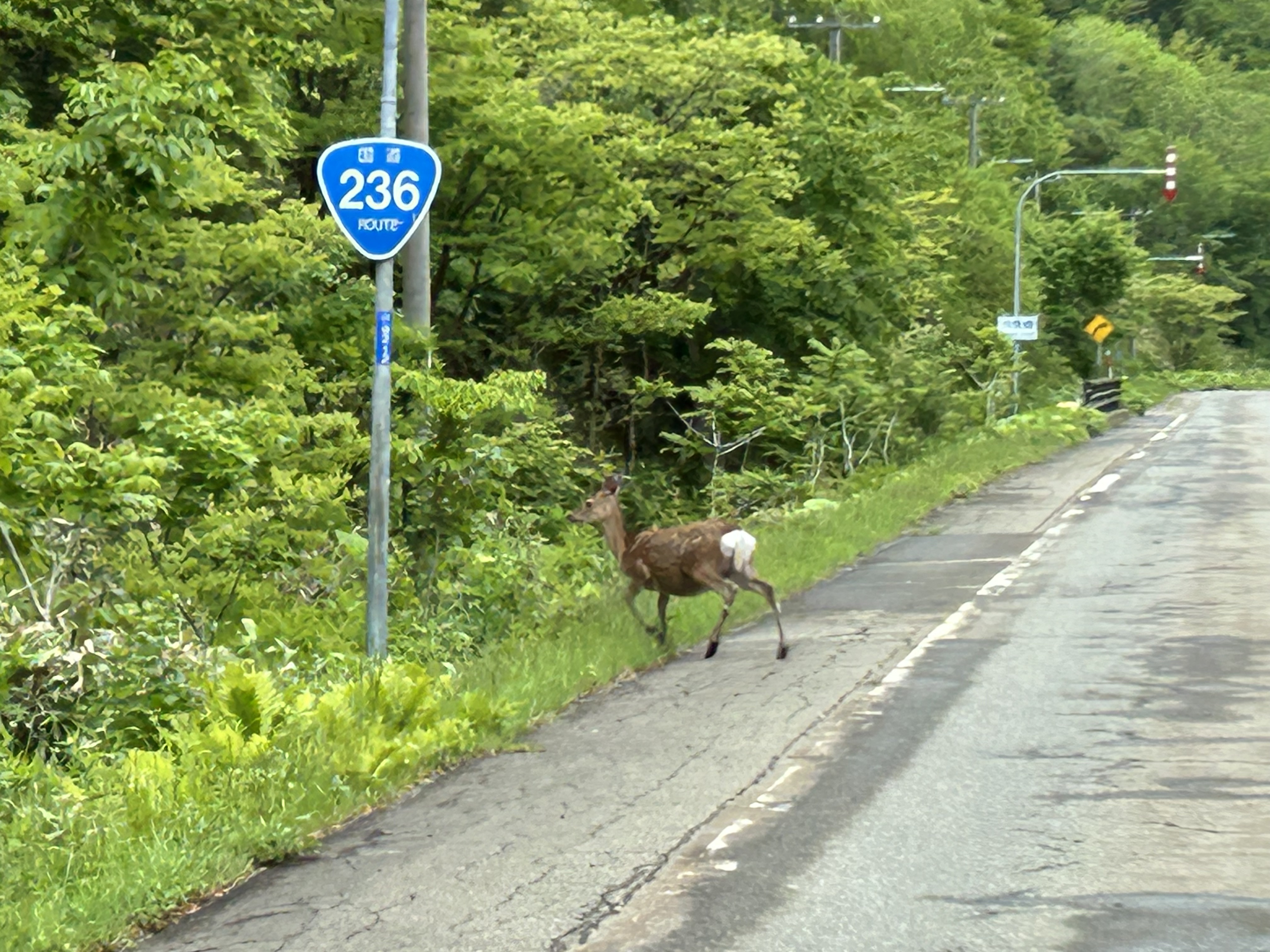 帯広へ向かう途中、道路の真ん中にエゾシカがいてこちらを見ている。車が近づくと流石にしげみの中へと逃げ出したが…。北海道だなぁ。