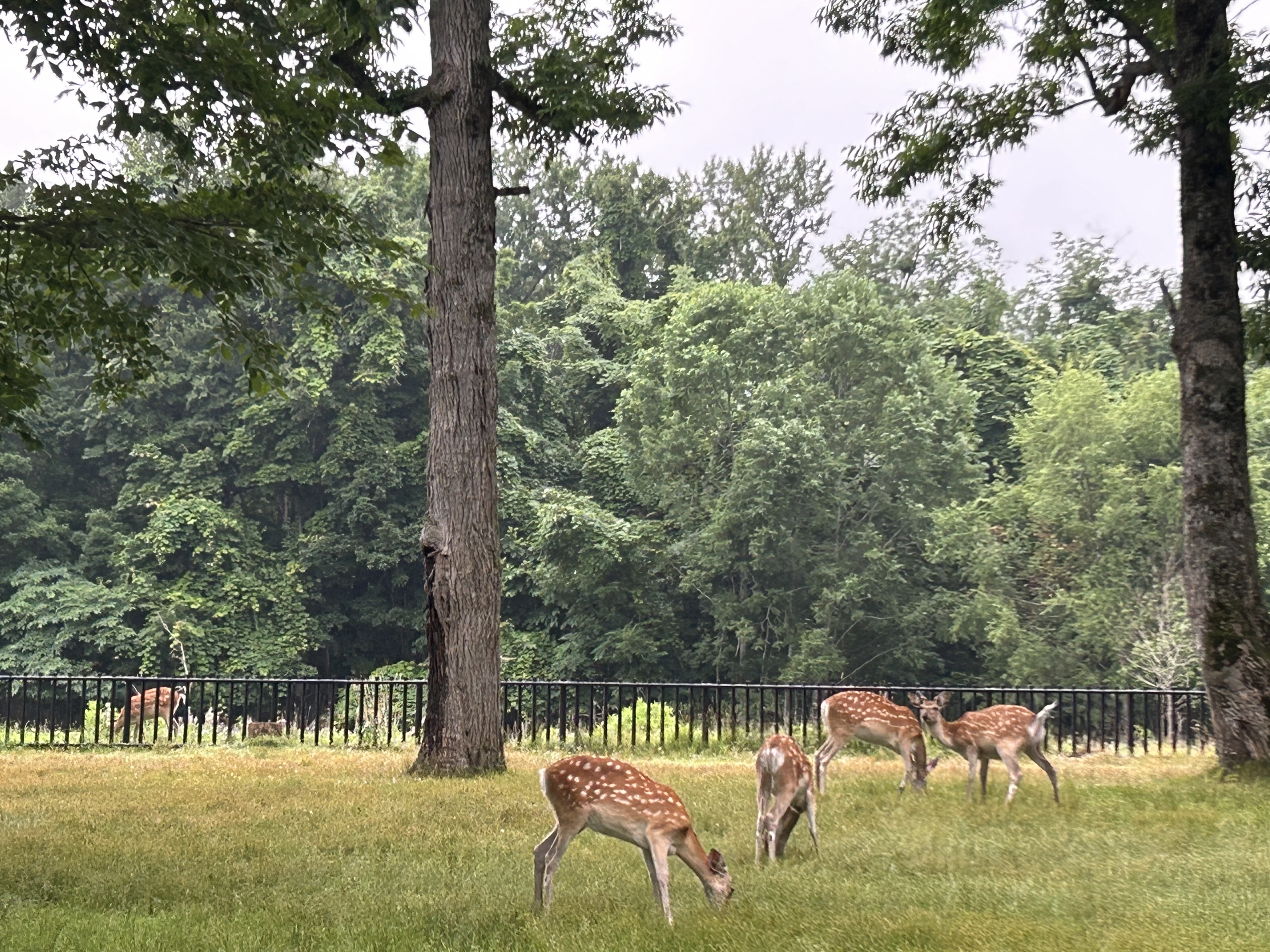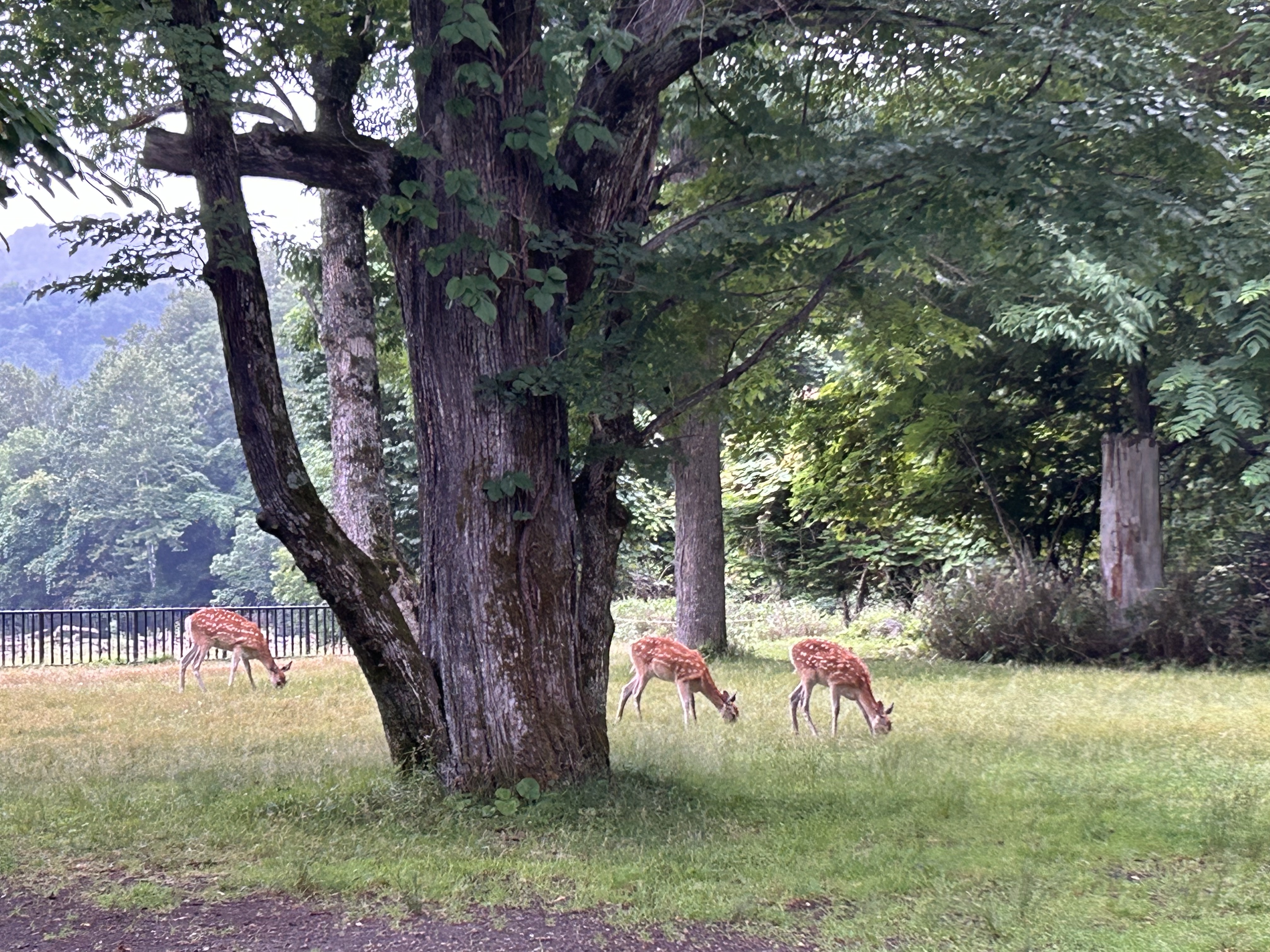 雨の朝。みーこが外へ出たらすぐ目の前で鹿5頭が朝食中。少しも驚かず黙々と…。野生がこんなでいいの?洗顔、歯磨きの間にどんどん近づいてくる。という感じで本日は鹿伸び伸びday。あちらこちら好きなように(でもしっかり警戒しつつ)草を喰み続けている。