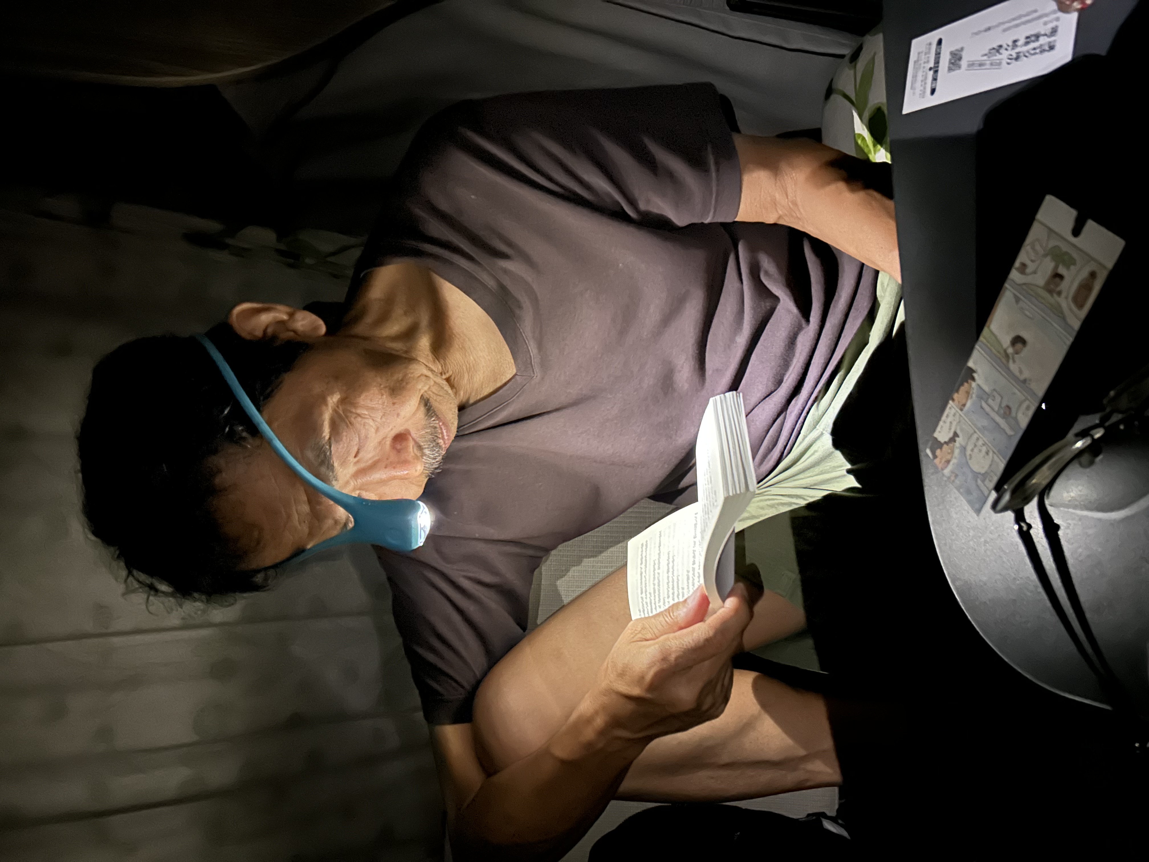 今日は“でかちん”を少しも動かしていないのでサブバッテリーが不足気味。夜は電気を節約してネックライトを頭につけて読書。