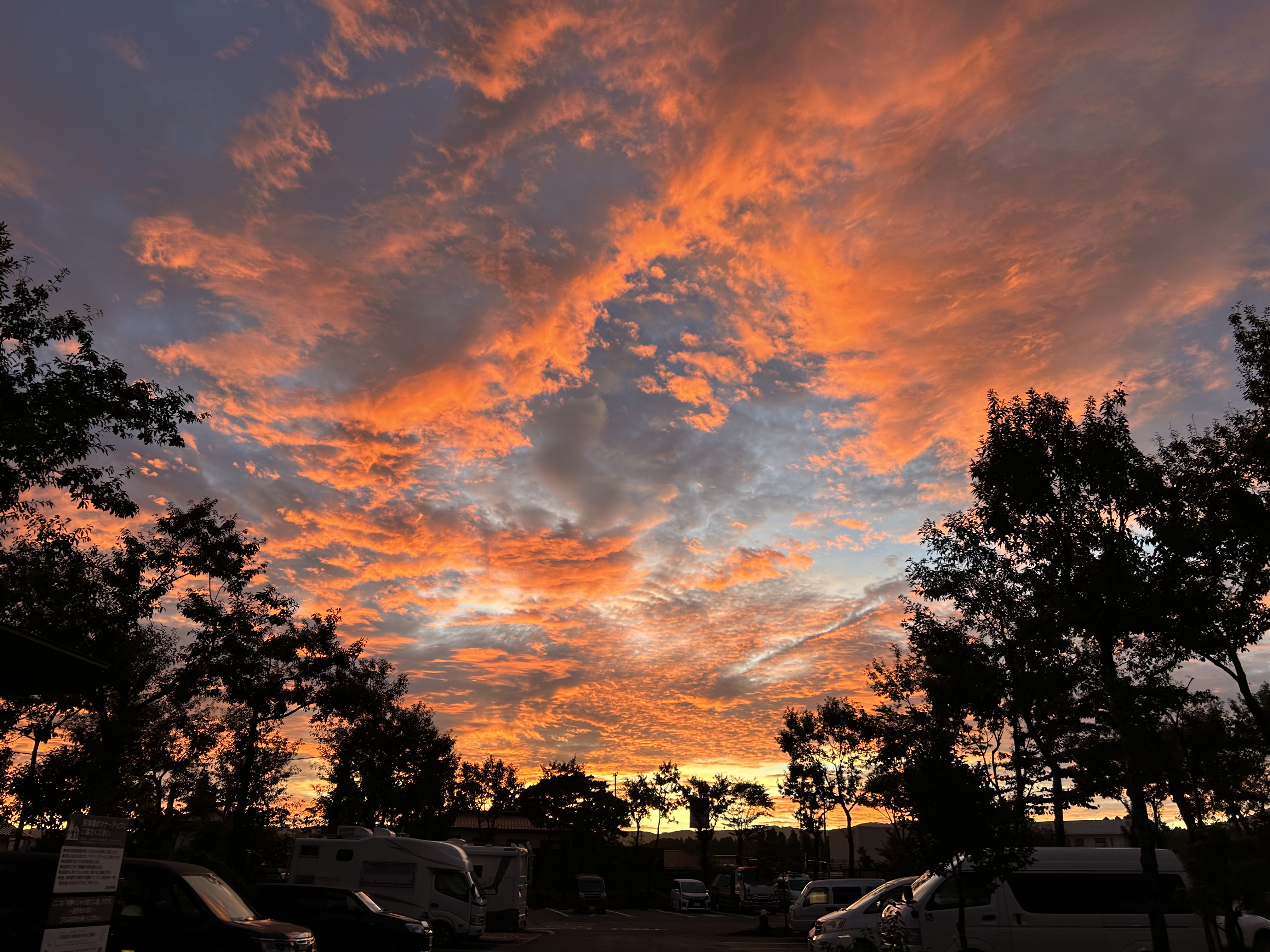 道の駅から綺麗な朝焼け。紅く染まる外輪山や鮮やかな緑に映える山々を楽しませてもらった。