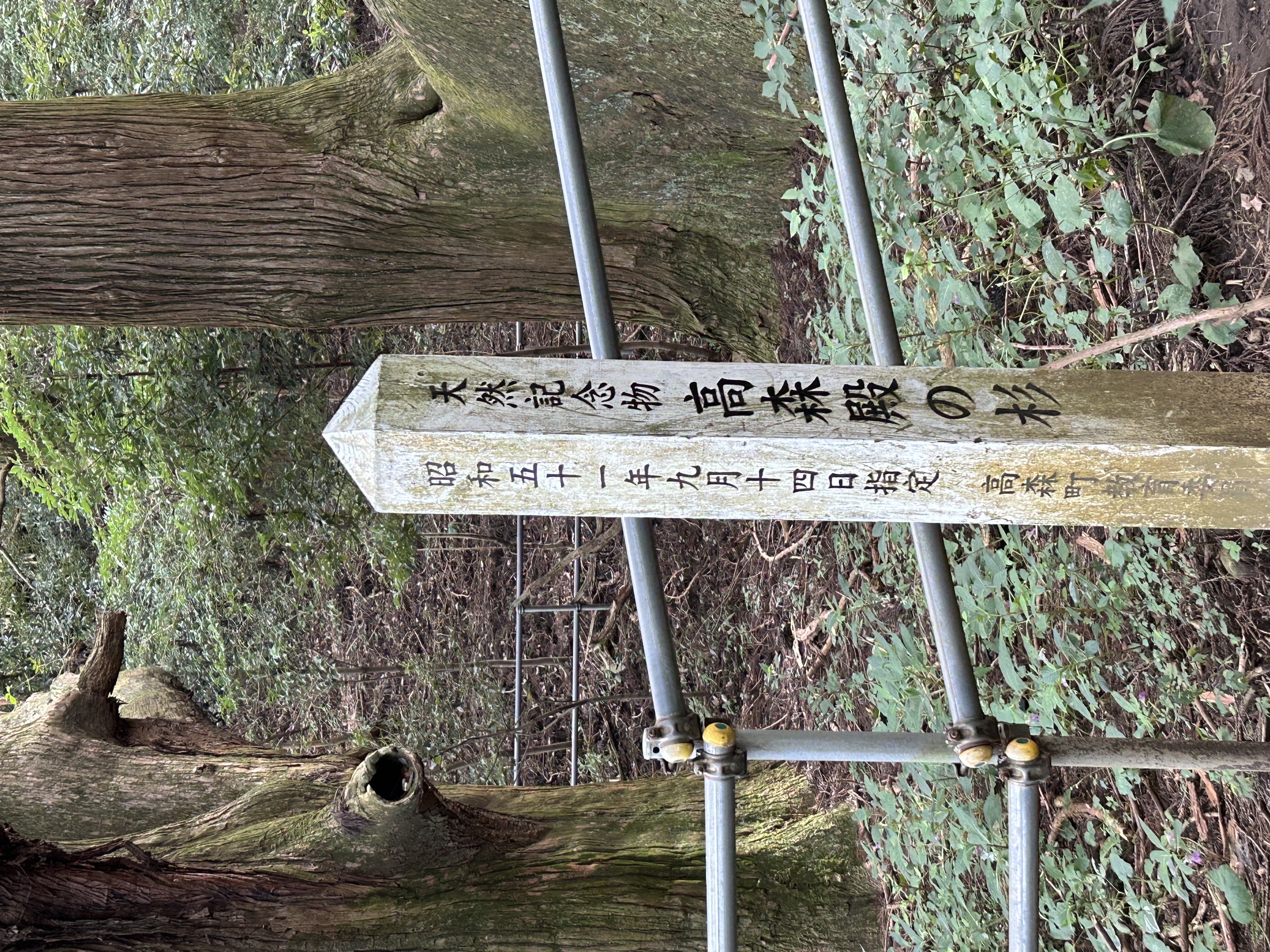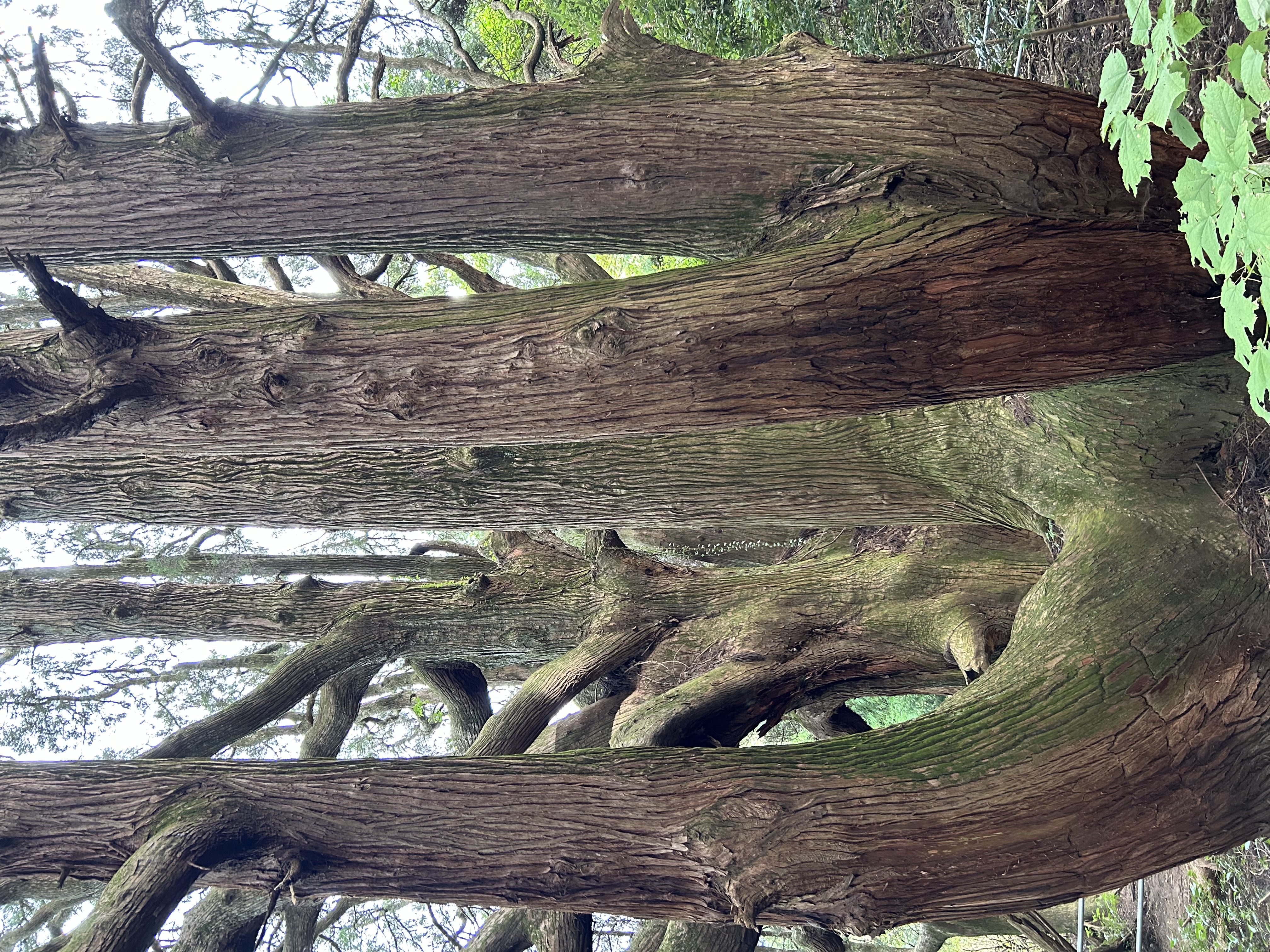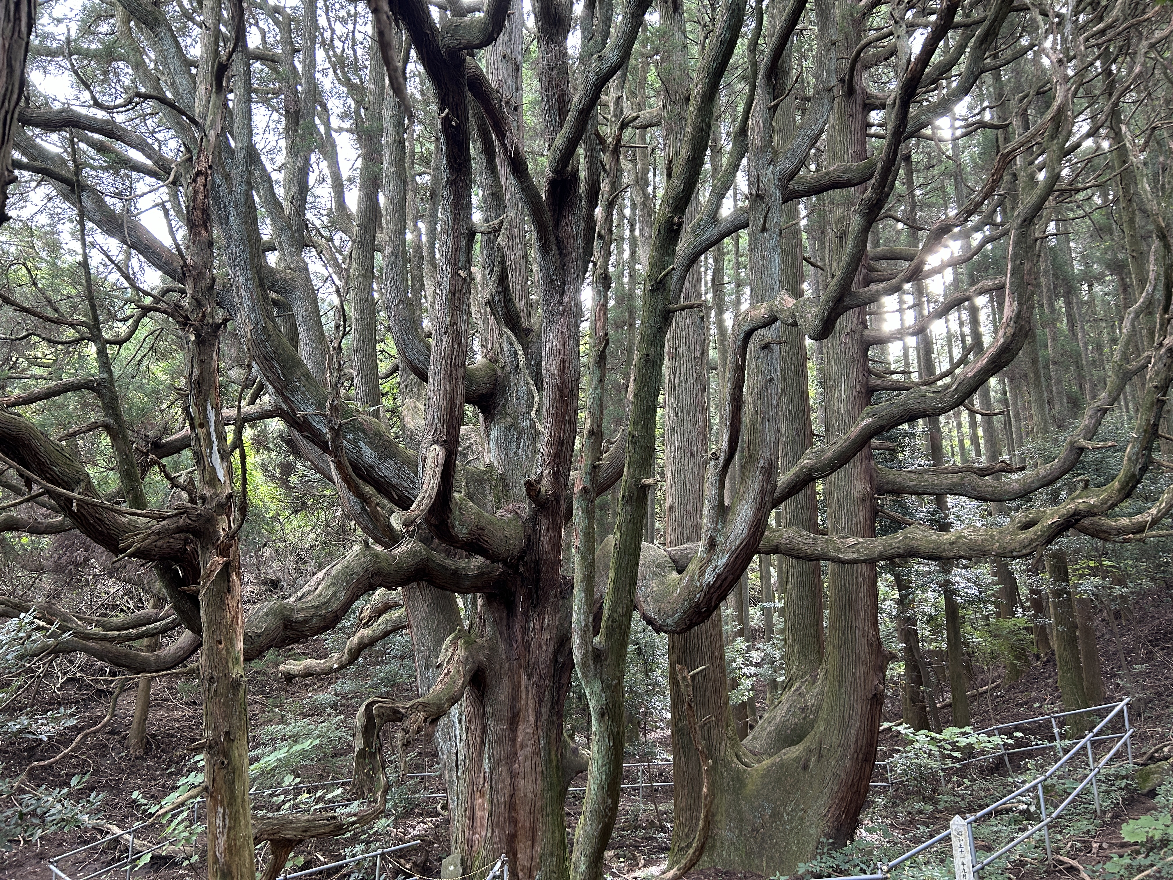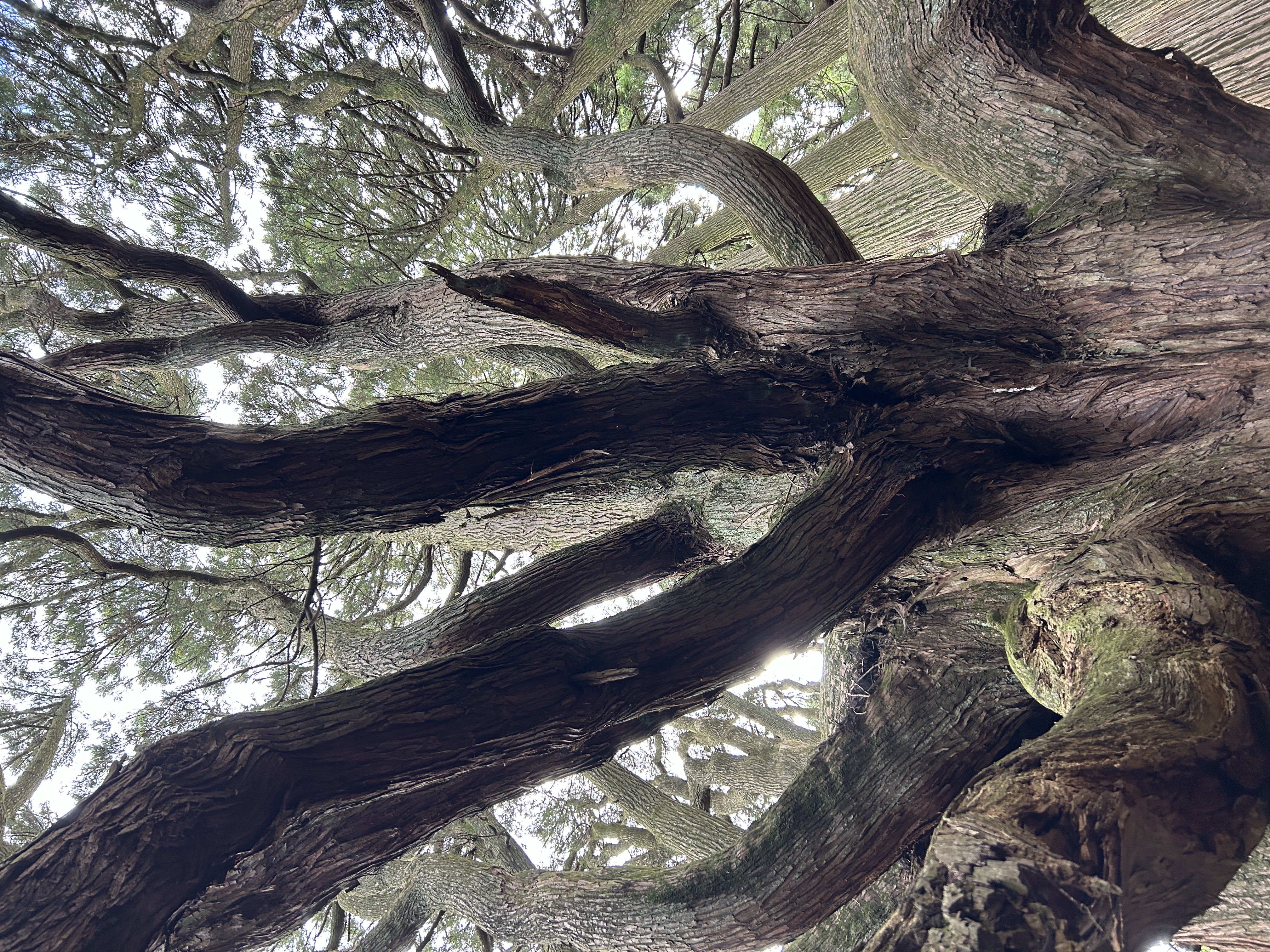 急傾斜の駐車場に停めて急登の坂をふうふう言いつつ歩いて行くと前方の暗い木立ちの間に突如立派な根元が!大きな巨樹が2本どど~んと!大感激!!2本の杉は一方が真っ直ぐに、他方はこれでもかと四方八方に枝を広げて大きな森を形成していおった。樹齢は400年ほどらしいけど素晴らしい生命感、存在感。