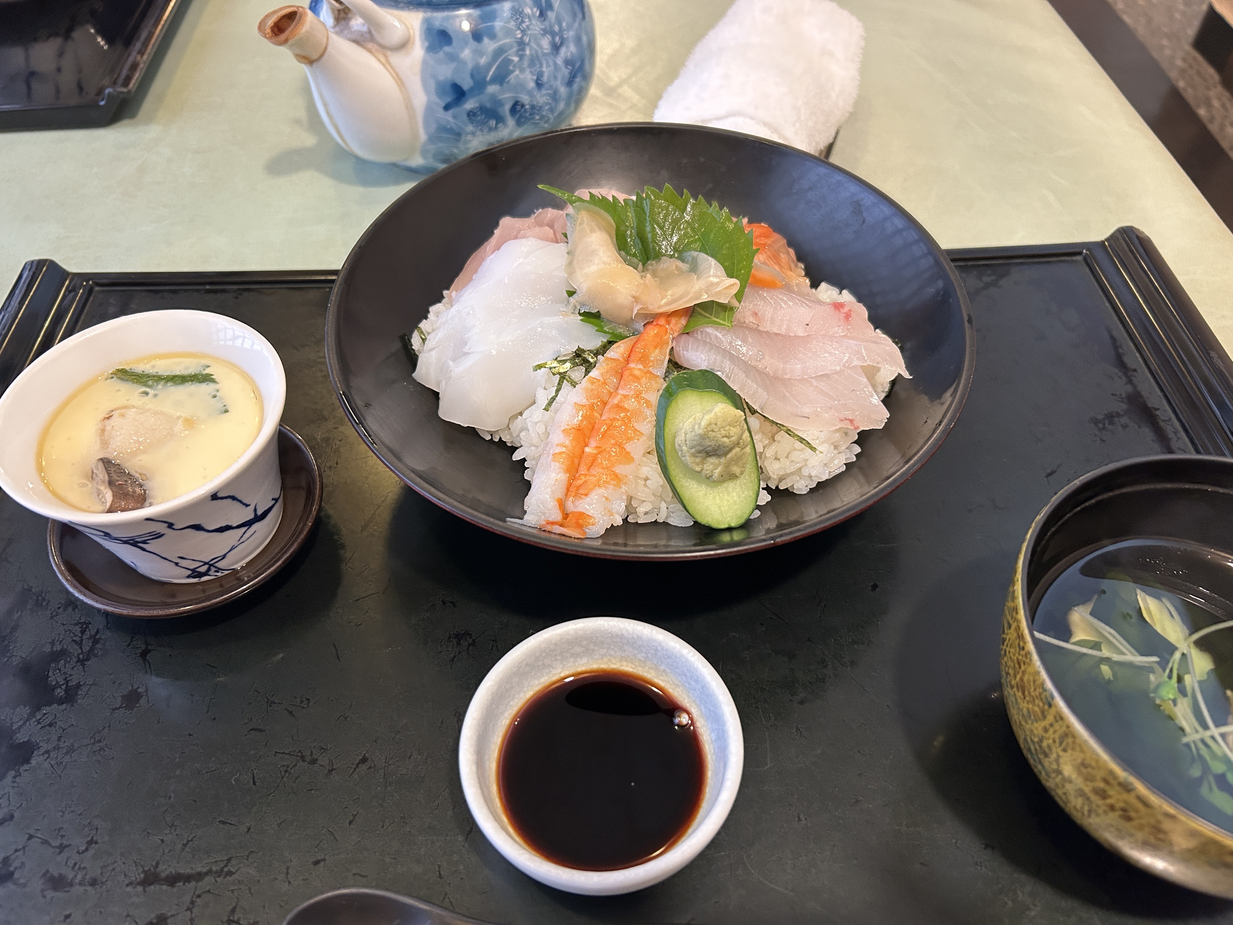 本日の昼食は、蕎麦・カレーを繰り返す我々には珍しく和食、日替わりランチ「海鮮丼」をいただく。老舗のようで、開店直後に入った我々の後にわらわらと。しっかり出汁の効いたお清し、茶碗蒸し、メインの海鮮丼とどれも予想外の美味さ。