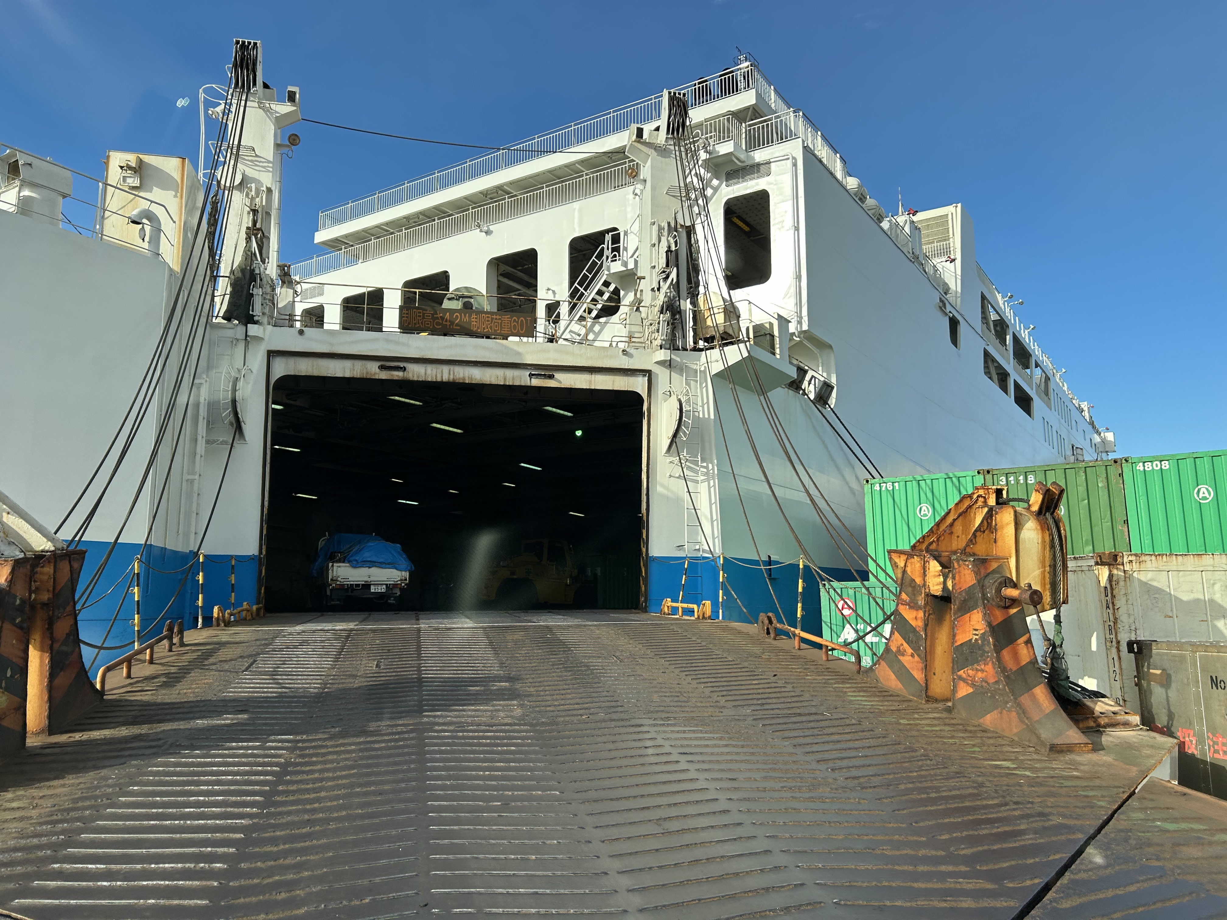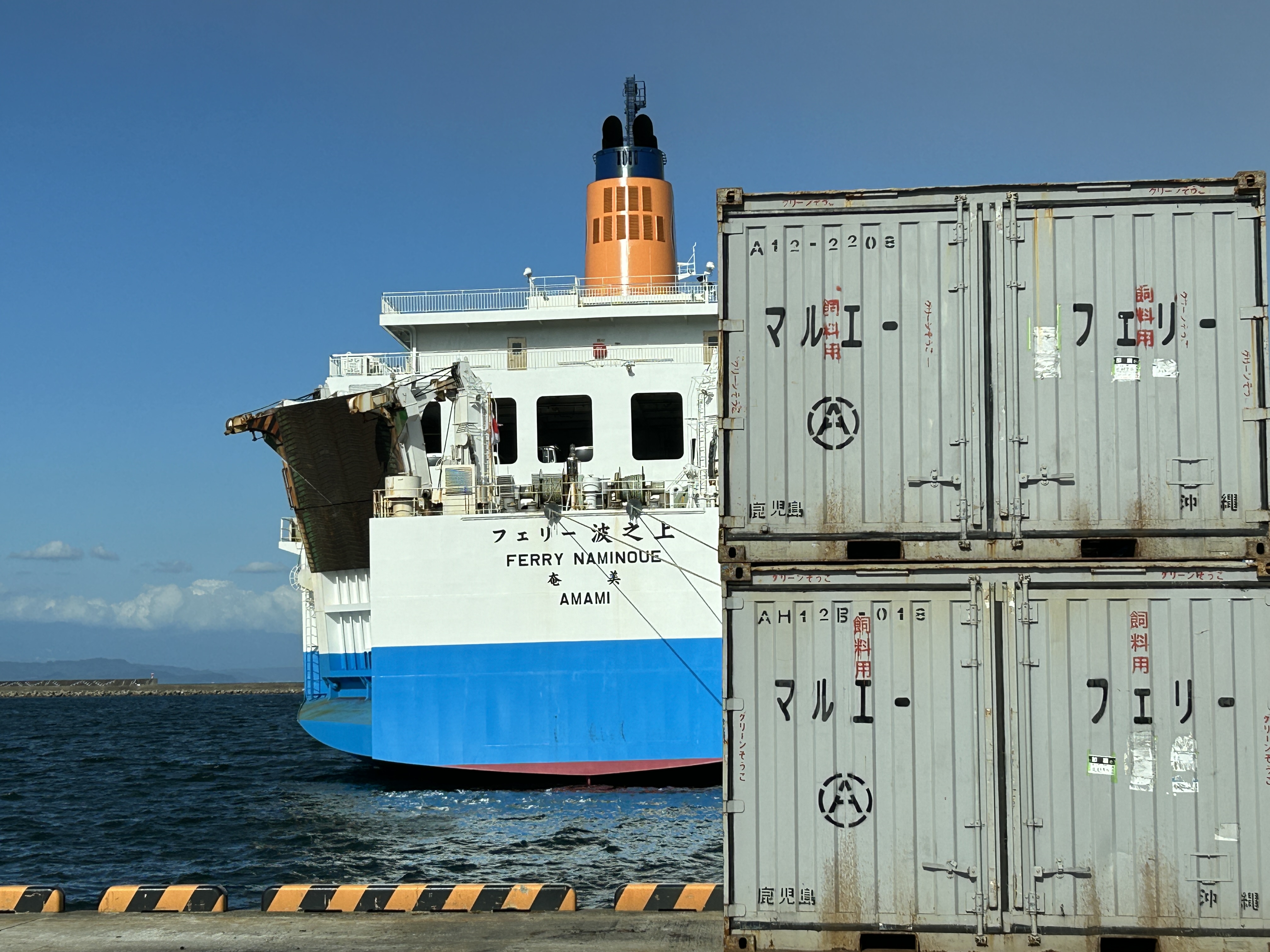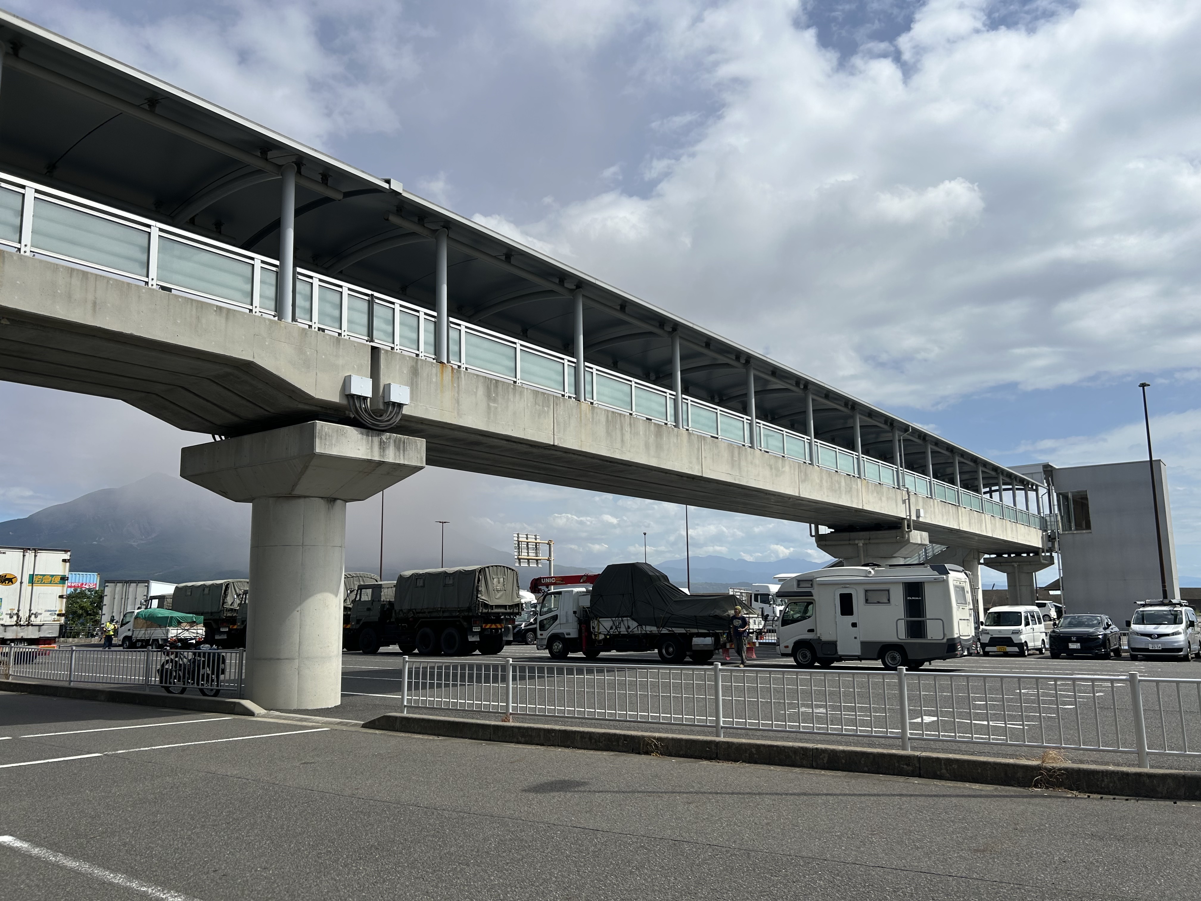 「マルエーフェリー/奄美・沖縄ターミナル」へ。桜島が小規模噴火したらしく火山灰の流れが見てとれる。