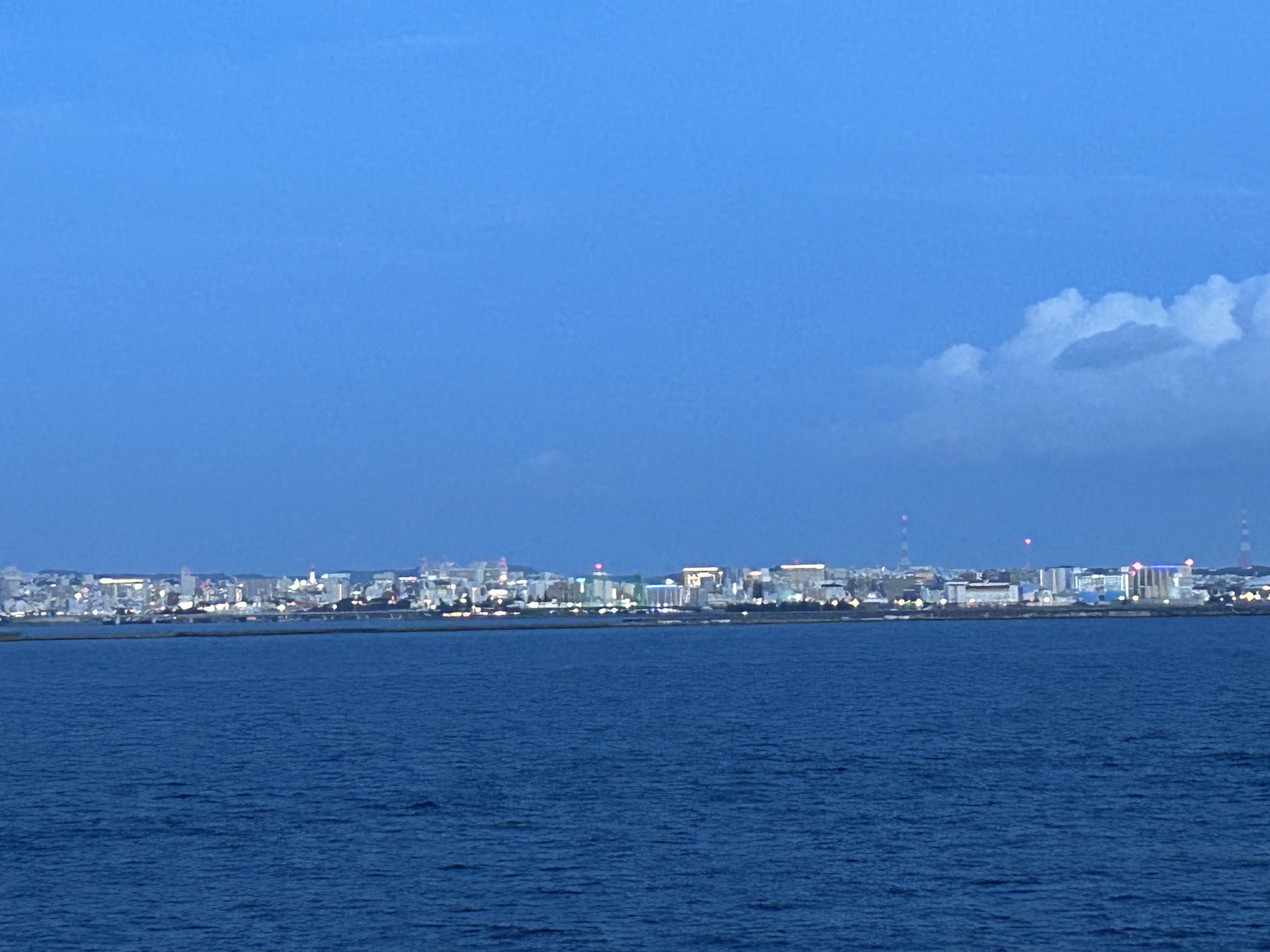 夕方18時30分“那覇”の市街が見えて来ました。 19時定刻通り那覇港着。 西町“りうぼう”で夕食と翌朝用食品を購入し、いざ自宅へ。